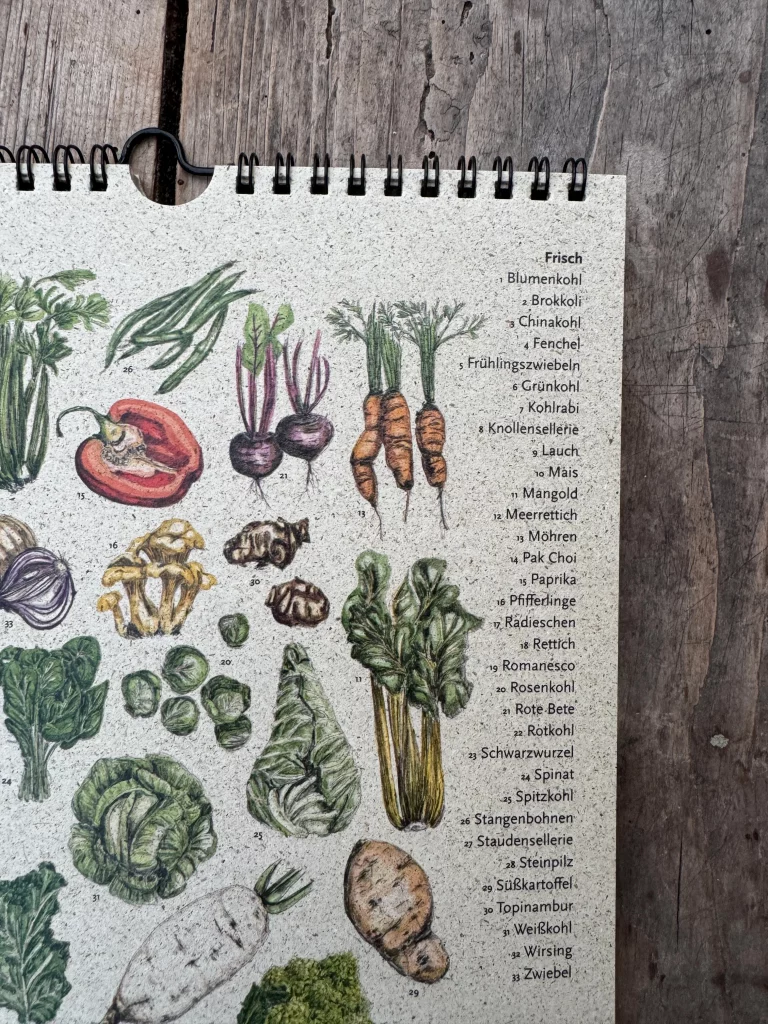 Der Kalender sorgt für Struktur in deinem Alltag: Jede Monatsübersicht unterscheidet klar zwischen frischem und lagerfähigem Gemüse. So weißt du sofort, was saisonal auf den Teller passt.