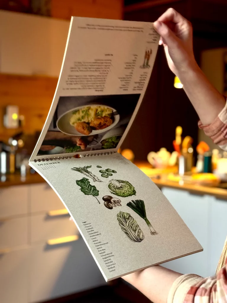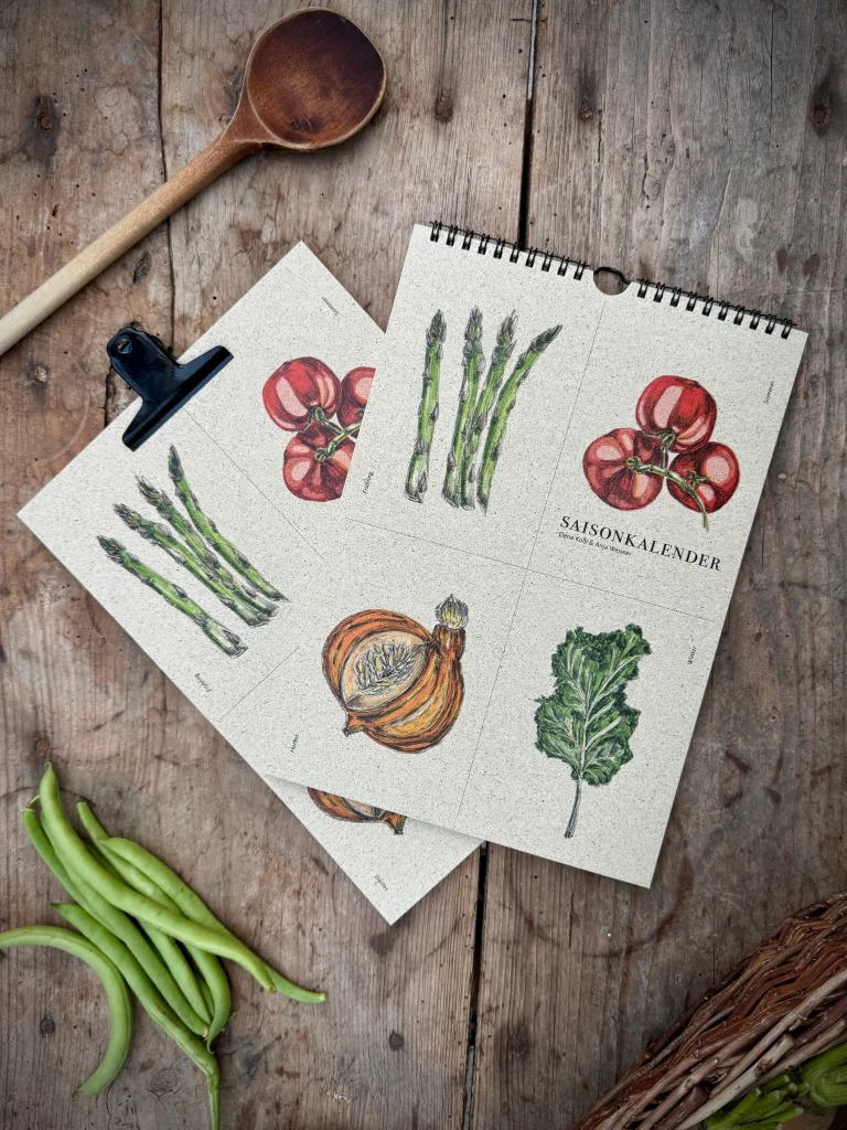 Ein besonderes Extra: Auf den Rückseiten findest du einfache, saisonale Rezepte. Sie inspirieren dich, Neues auszuprobieren und das Beste aus jeder Jahreszeit herauszuholen. Ob knackige Radieschen im Frühling, aromatische Tomaten im Sommer oder wärmender Kohl im Winter – der Kalender zeigt dir, wie abwechslungsreich regionale Küche sein kann.